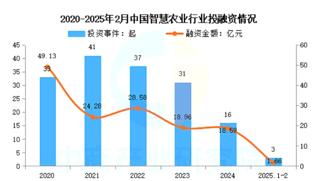 近年來,中國智慧農業行業投資事件數量及規模整體呈波動上升趨勢。IT桔子數據顯示,2024年我國智慧農業投資數量16起,已披露融資金額達18.59億元。2025年1-2月我國智慧農業投資數量3起,已披露融資金額達1.66億元。